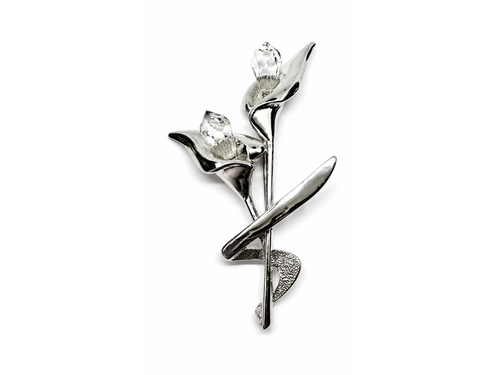 Květinová brož ve tvaru kaly s květy tvořenými crystaly SWAROVSKI. Brož se uchytí pomocí jehly a uzavře otočnou mechanikou. Nejkvalitnější povrchová úprava rhodium zajišťuje dlouhodobou ochranu a stálost. Brož je dodávána v dárkové krabičce.