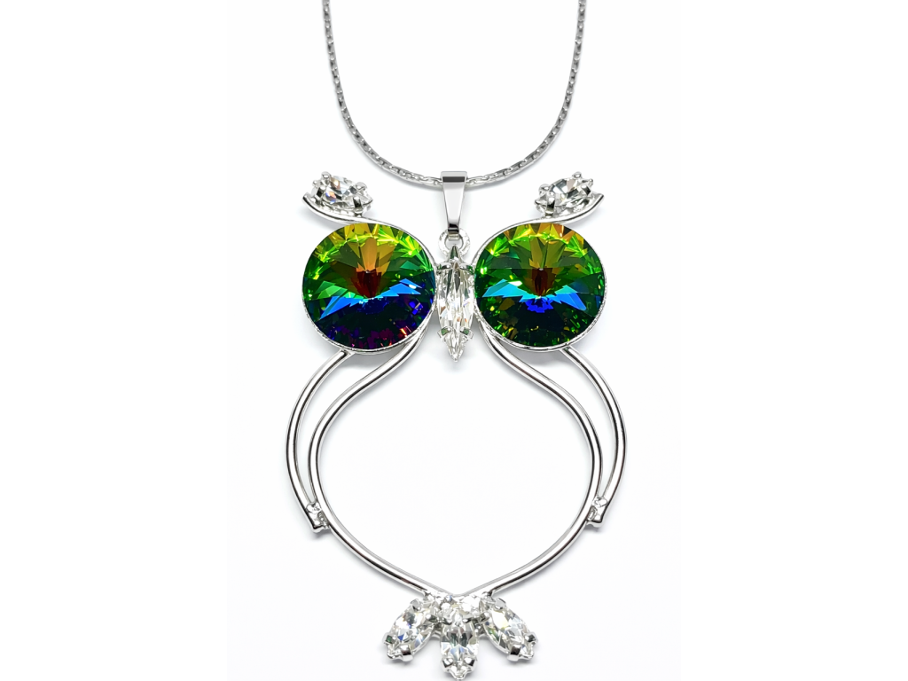 Přívěšek drátěné sovičky s crystaly a kamínky SWAROVSKI zavěšený na jemném 40 cm dlouhém řetízku s 5 cm prodlužovací adjustou..Včechny kovové části jsou kryty nejkvalitnější galvanickou úpravou rhodiem resp. platinou. Náhrdelník je dodáván v dárkové krabičce.